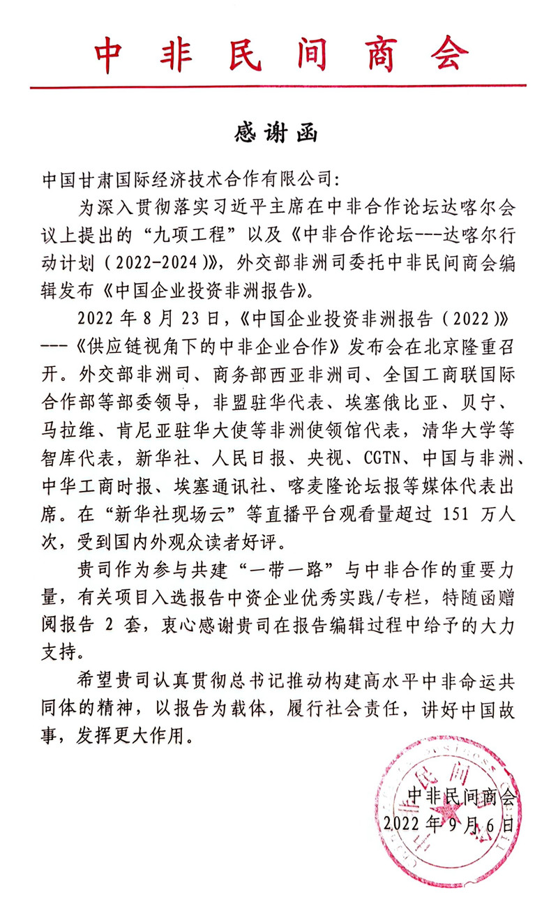 此次由中非民间商会编撰的《中国企����� �������Ƴ������������ �������Ƴ�������业投资非洲报告(2022)——供����� �������Ƴ������������ �������Ƴ�������应链视角下的中非企业合作》英文版����� �������Ƴ������������ �������Ƴ������������ �������Ƴ������������ �������Ƴ�������和法文版同时在京发布,发����� �������Ƴ������������ �������Ƴ�������布会在社会层面引起了广泛关注,中甘国际入选中����� �������Ƴ����������� �������Ƴ������������ �������Ƴ������������ �������Ƴ�������资企业优秀实践/专栏,标志着我司海外工作成果在社����� �������Ƴ������������ �������Ƴ������������ �������Ƴ������会层面取得的肯定,进一步强����� �������Ƴ������������ �������Ƴ������������ �������Ƴ������������ �������Ƴ������化了中甘国际的品牌影响力,极大����� �������Ƴ������������ �������Ƴ�������地鼓舞了广大干部职工的工作热情,为我司今后����� �������Ƴ������������ �������Ƴ������������ �������Ƴ������持续开拓海外市场、提升企业竞争力营造了����� �������Ƴ����������� �������Ƴ�������良好的社会效应。