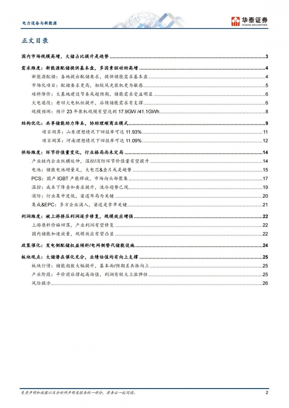 节成本约占59%/16%/9%����� �������Ƴ������������ �������Ƴ������������ �������Ƴ������������ �������Ƴ�������/16%。储能电池价值量占比高,我们预计未来����� �������Ƴ������������ �������Ƴ������������ �������Ƴ������������ �������Ƴ�������仍将保持较高的话语权,温控与消防环节的价值量有望����� �������Ƴ������������ �������Ƴ������������ �������Ƴ������提升。产业链内企业具有纵横延����� �������Ƴ������������ �������Ƴ�������伸趋势。电池环节新老厂商积极扩产,行业整����� �������Ƴ������������ �������Ƴ������������ �������Ƴ������������ �������Ƴ������体供给宽松,大电芯&叠片或是����� �������Ƴ����������� �������Ƴ����������� �������Ƴ������������ �������Ƴ�������趋势。PCS环节海外IGBT仍����� �������Ƴ������������ �������Ƴ������������ �������Ƴ������������ �������Ƴ������供应紧张,国内厂商积极扩产,产品价����� �������Ƴ������������ �������Ƴ�������格竞争日趋激烈化,市场向头部聚集。温控����� �������Ƴ������������ �������Ƴ������������ �������Ƴ������������ �������Ƴ������环节,成本下降叠加要求提升,液冷趋势已现。����� �������Ƴ������������ �������Ƴ�������消防环节,行业集中度低,渠道布局为关����� �������Ƴ������������ �������Ƴ������键。集成&EPC����� �������Ƴ������������ �������Ƴ�������环节,多方企业涌入加剧竞争,渠����� �������Ƴ������������ �������Ƴ������������ �������Ƴ������������ �������Ƴ�������道是拿单关键,强者恒强。